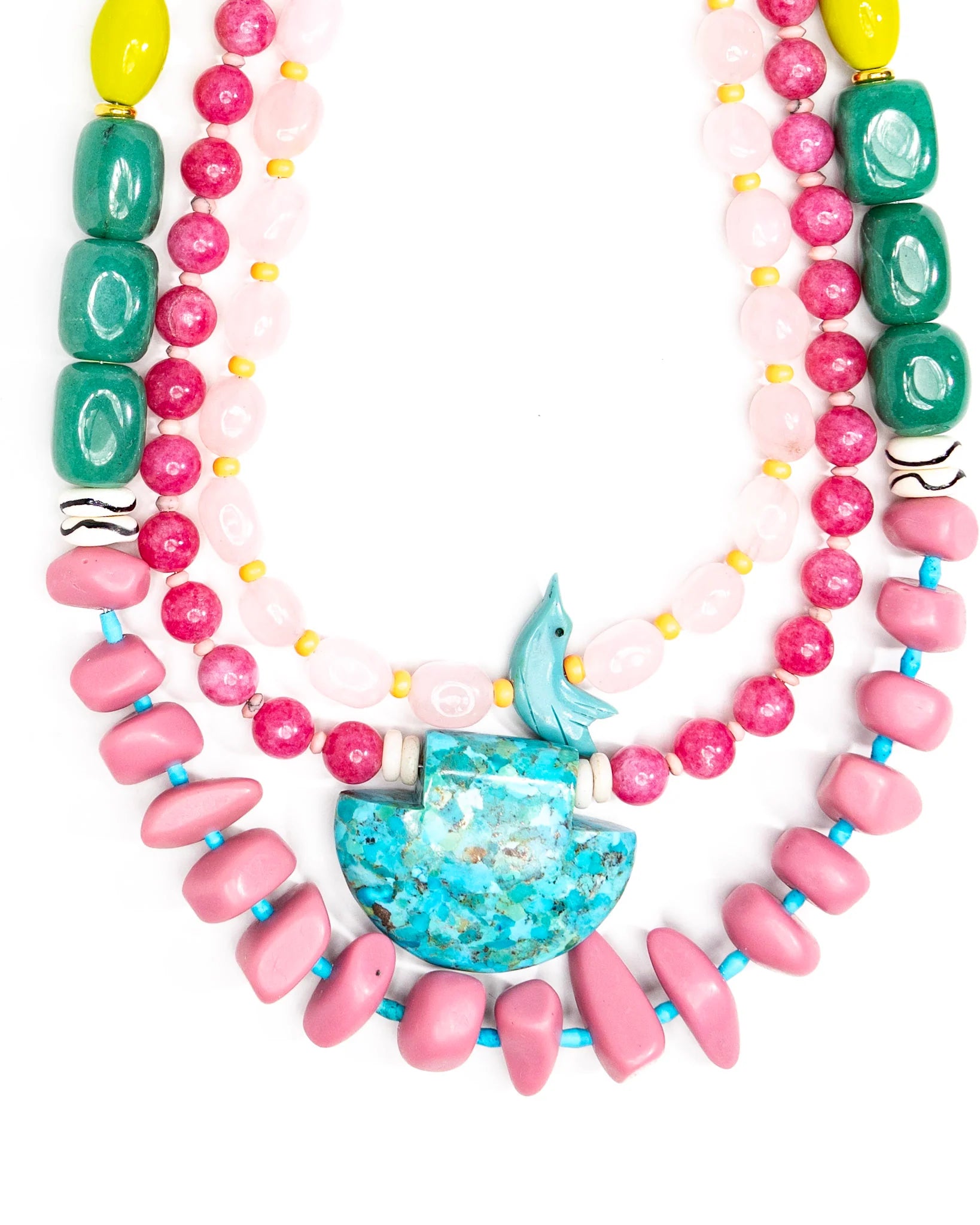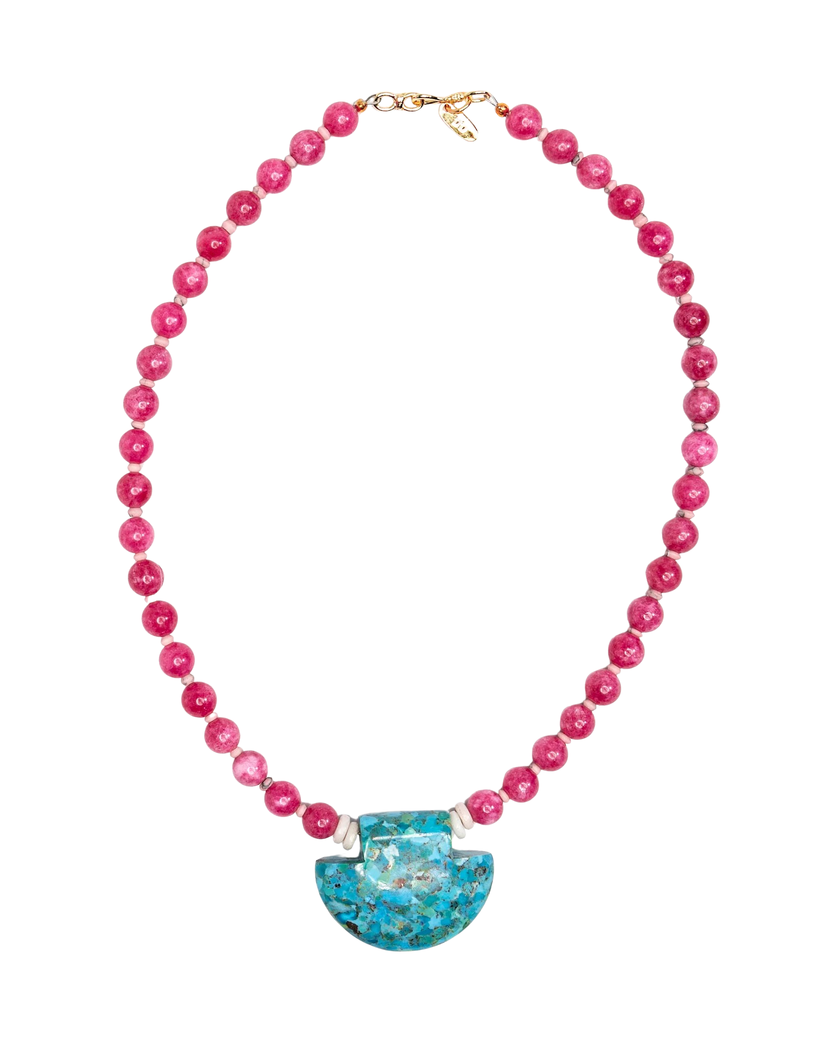 Turquoise drop shaped pendant mixed with fuchsia glass beads and African cream spacers. 17.5” long.