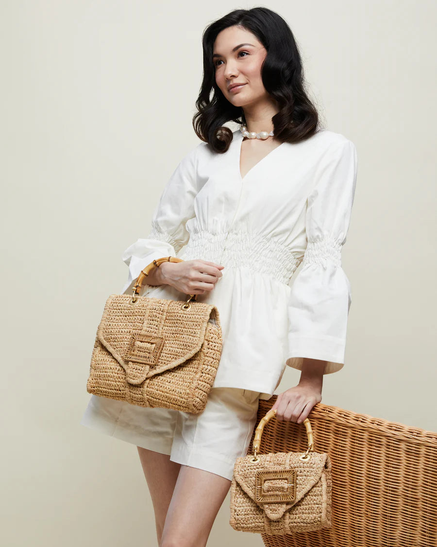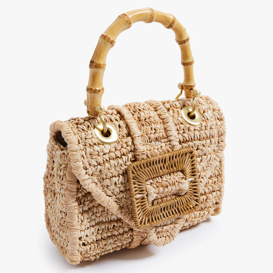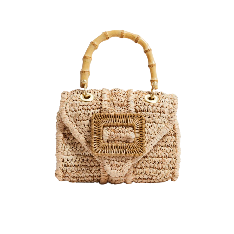 • Handwoven raffia handheld mini bag with a bamboo handle and rattan buckle