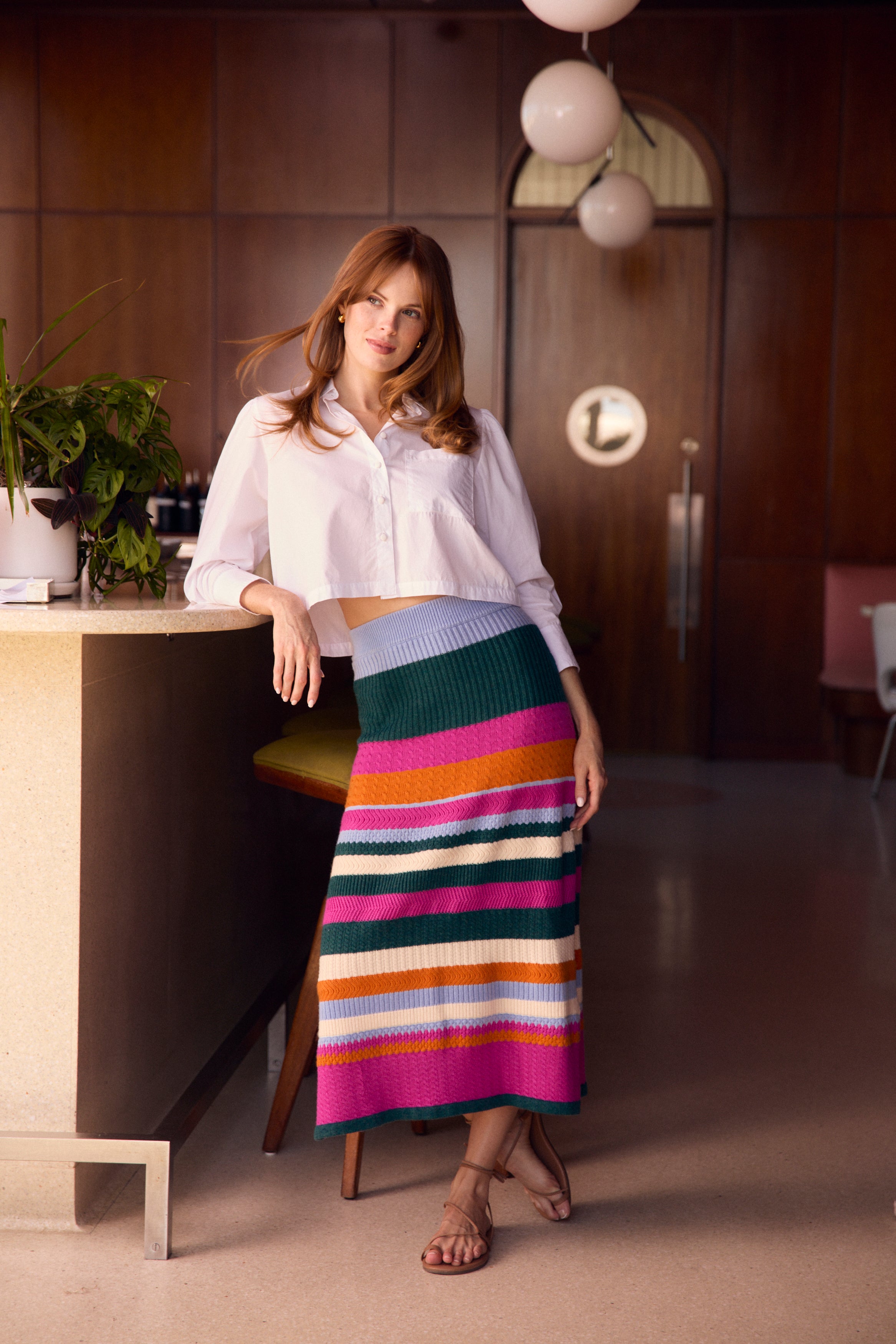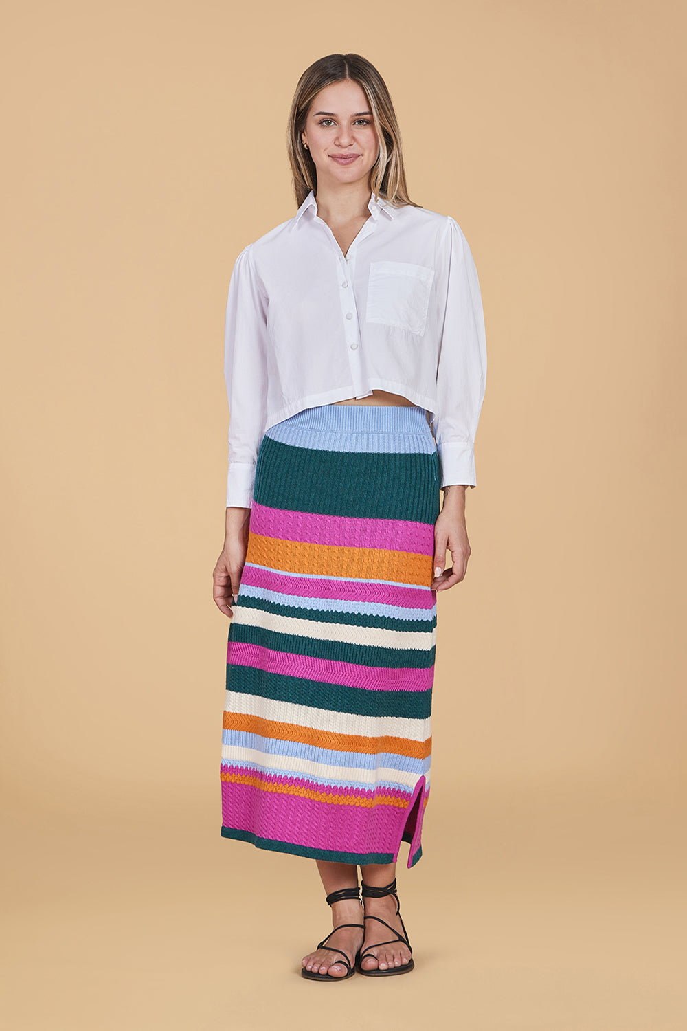Instantly elevate your cold-weather wardrobe with the ultra-flattering Birdie Skirt. This midi features a pencil silhouette with a stretch, striped knit design - making it both comfortable and chic. We love it paired with a chunky solid sweater and boots.