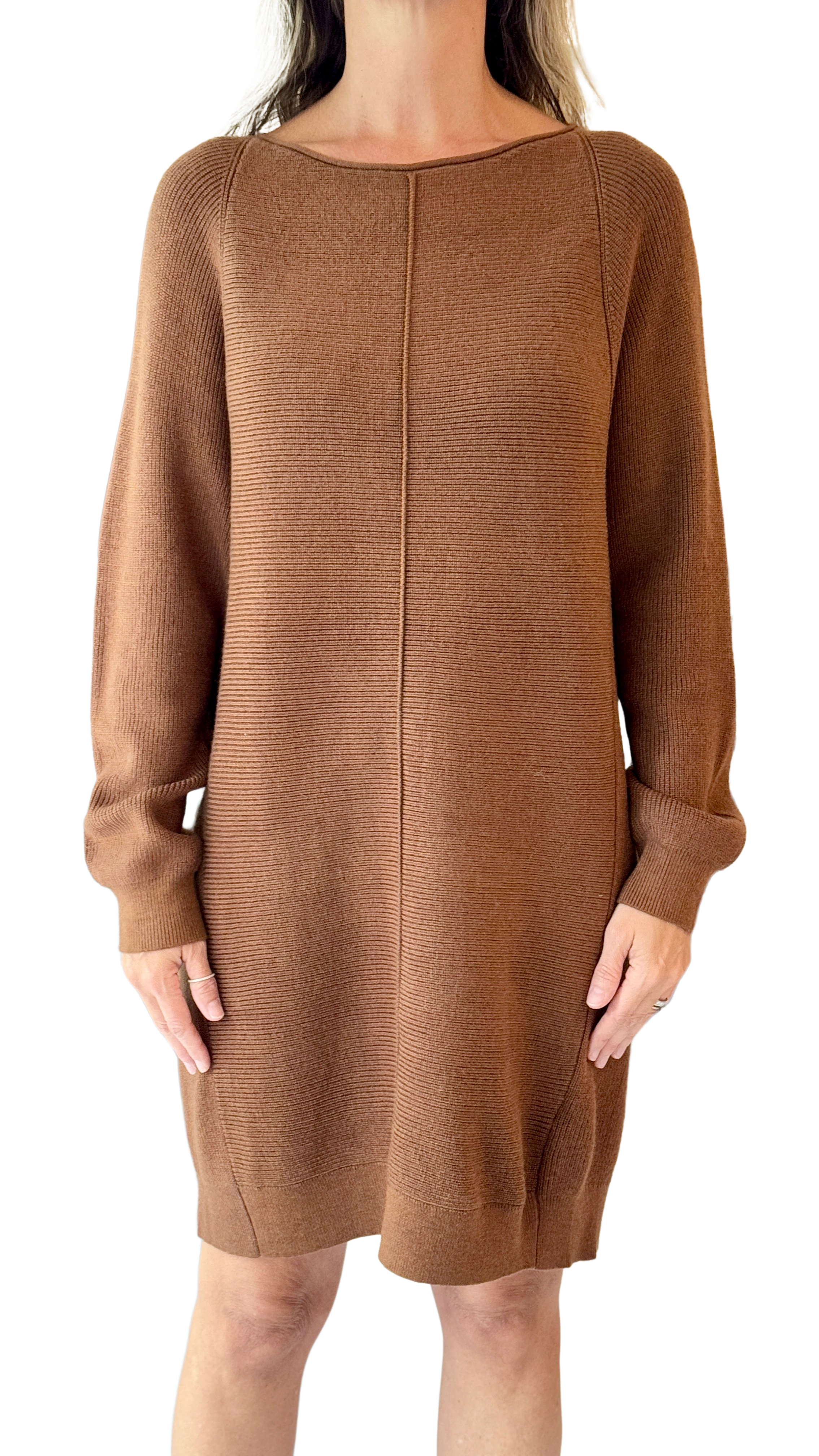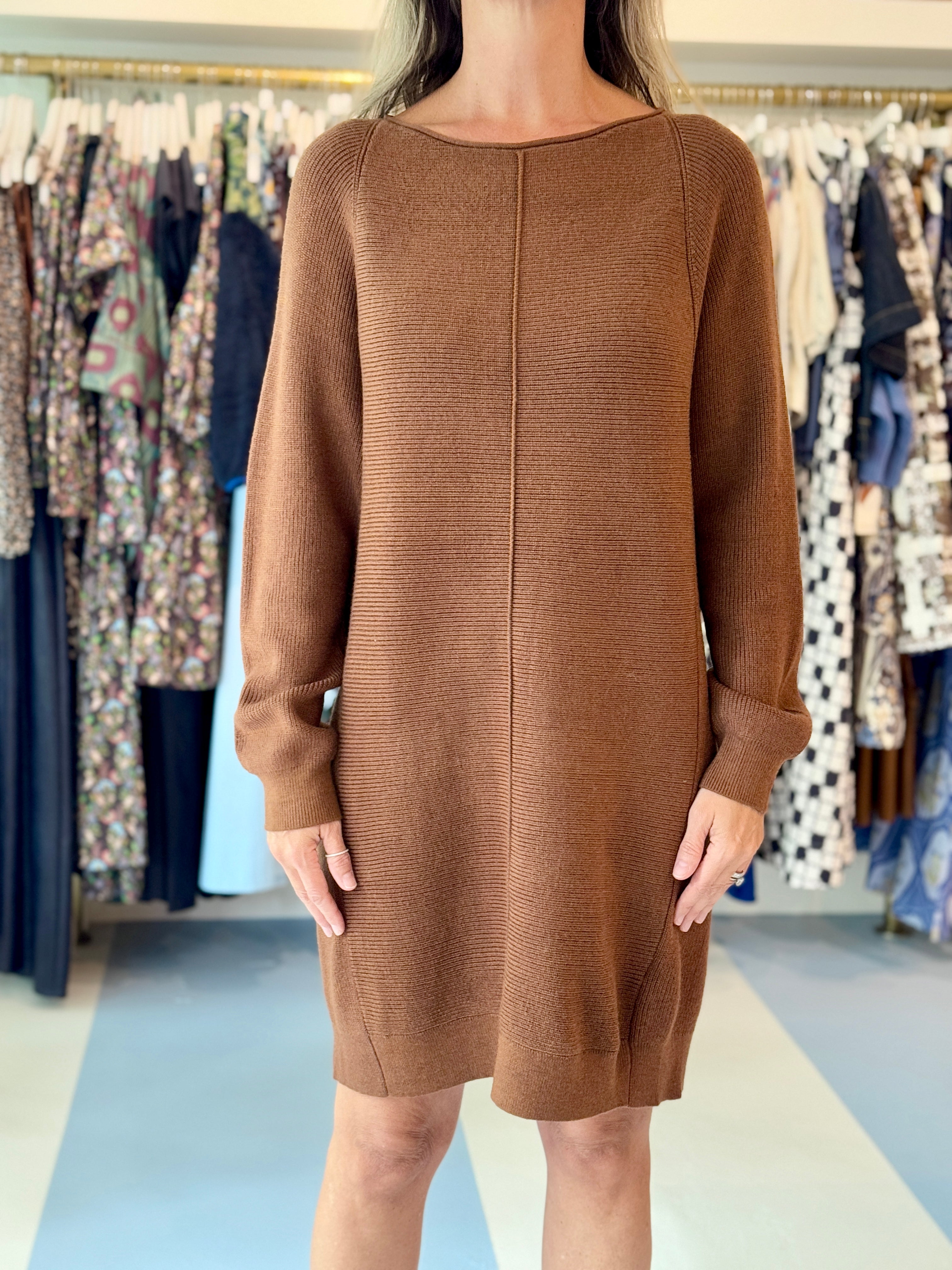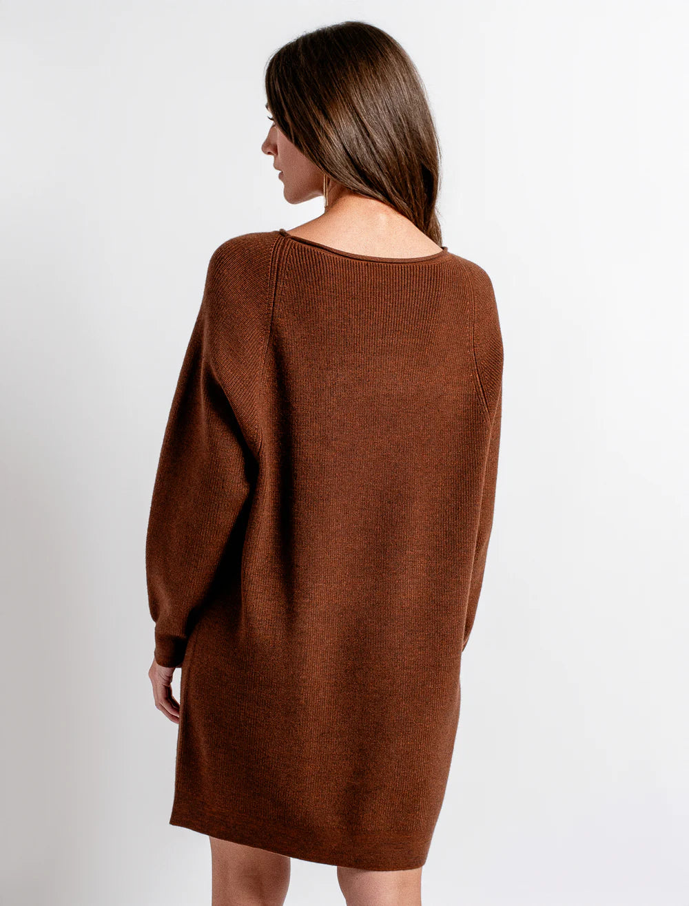 Sweater dress with long raglan sleeve, center front piping and roll hem accents