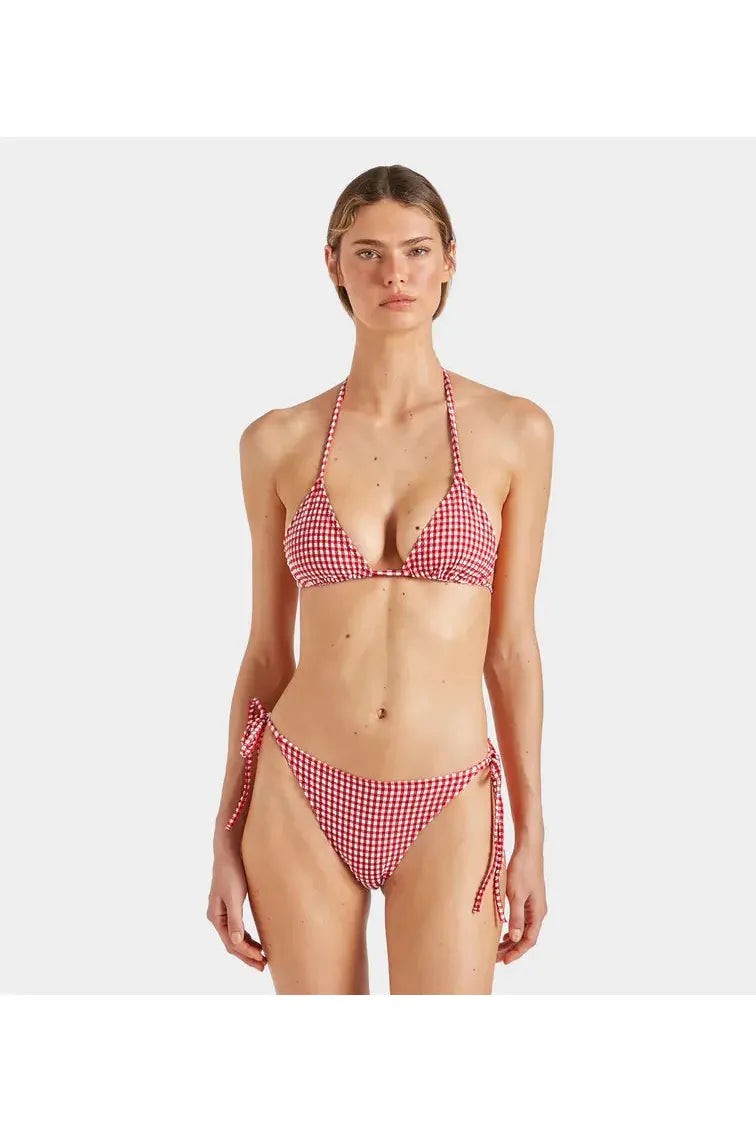The Sabrina bikini is fabricated from ultra-lightweight, quick-drying, woven bi-stretch seersucker gingham. Featuring a classic triangle fit and adjustable neck and side ties.