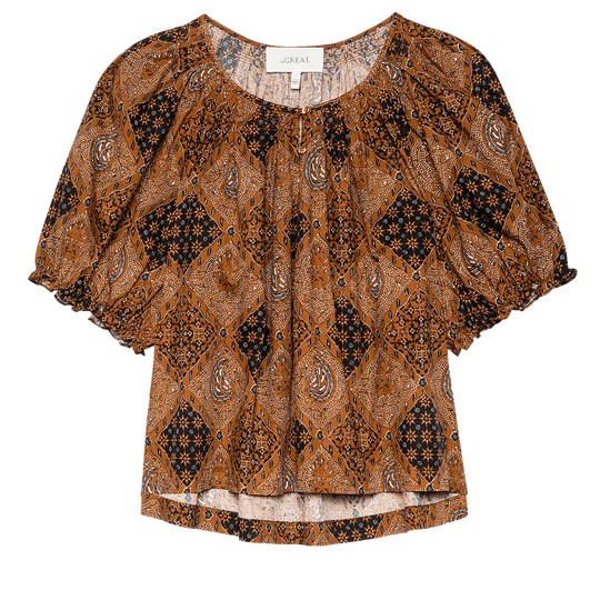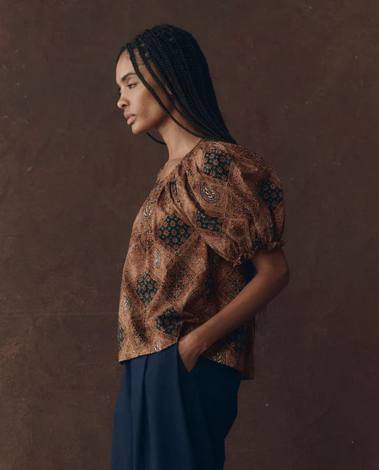 The Moorland Top is an easy pullover with thoughtful vintage details throughout. It features a scooped neckline with a deep V opening, delicate binding and trapunto stitching, romantic puff sleeves, and a swingy fit through the body. The bandana-inspired print adds nostalgic charm.