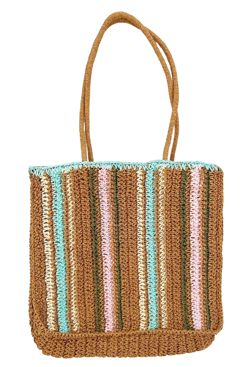 A vibrant mix of earthy and pastel stripes makes this tote a standout for everyday adventures. Handwoven with care and finished with natural raffia handles, it’s equal parts relaxed and refined—perfect for morning markets, coastal getaways, or just adding a splash of color to your routine.