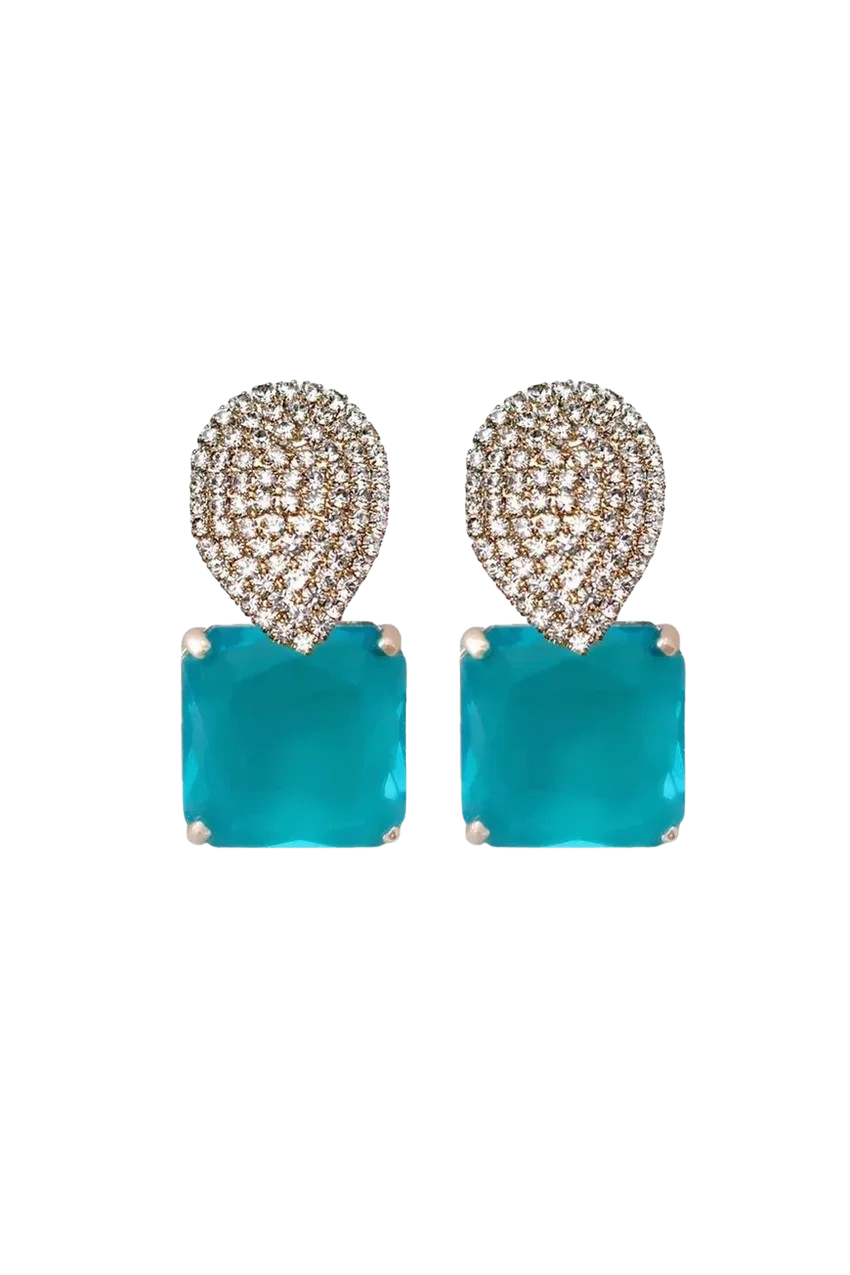 These retro-inspired holiday statement earrings feature a sparkling pave crystal teardrop top and a bold turquoise gum drop-style stone. The rich aqua hue adds a festive, vibrant twist to any holiday or winter look—perfect for parties, gifting, or standout year-round glam.