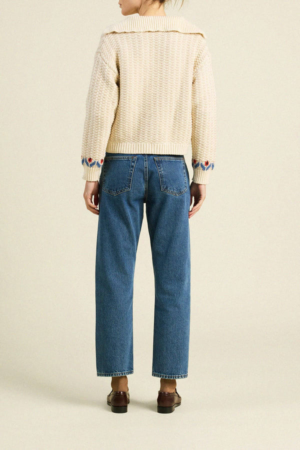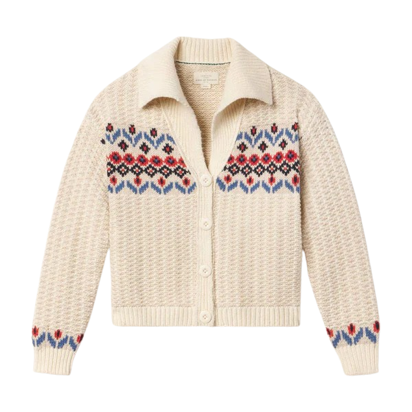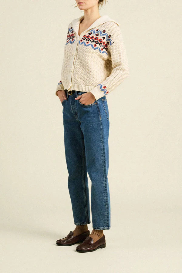 Trovata's Savannah cardigan has a textured basket weave in antique white with complementary cream sailor collar and cuffs. Finished with gold owl buttons. Shown here in Antique White Fairisle and made from merino wool.