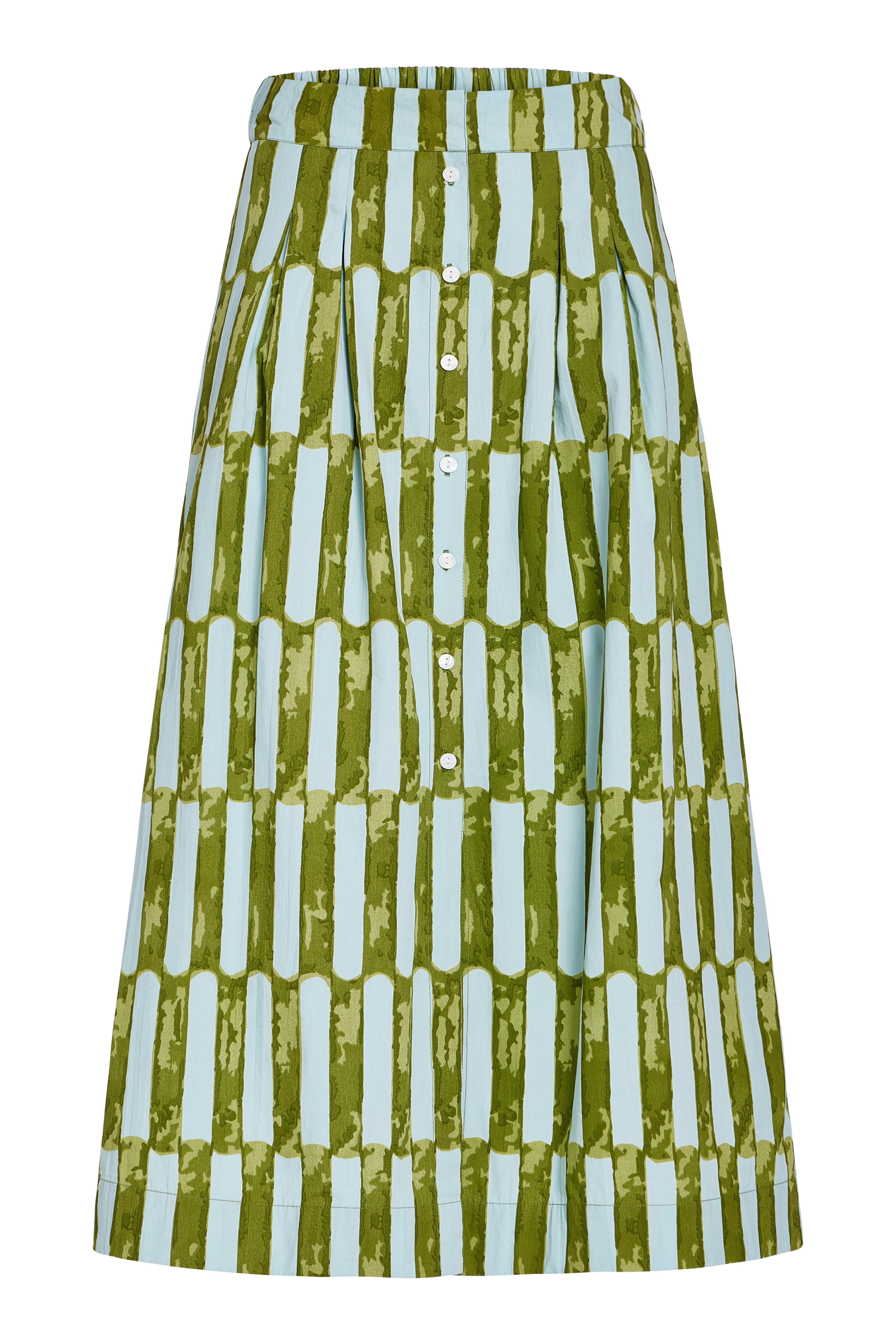 The Scout Skirt is a high-waisted, A-line silhouette with a flattering midi length. It features a button-front closure, wide waistband, and soft pleating for added volume and ease. Side pockets add a functional touch, making it as practical as it is polished.