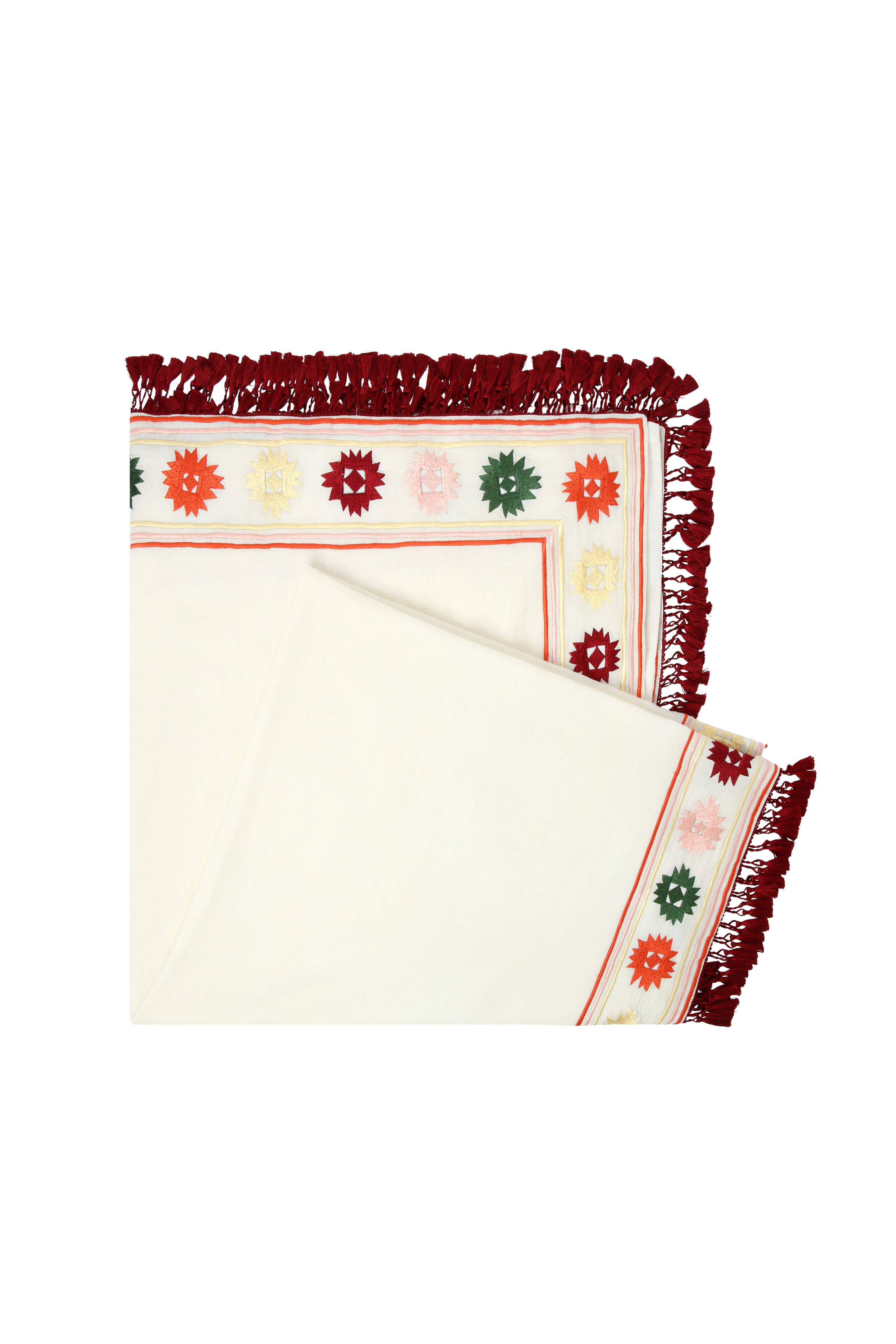 • Burgundy tassel fringe along the edges