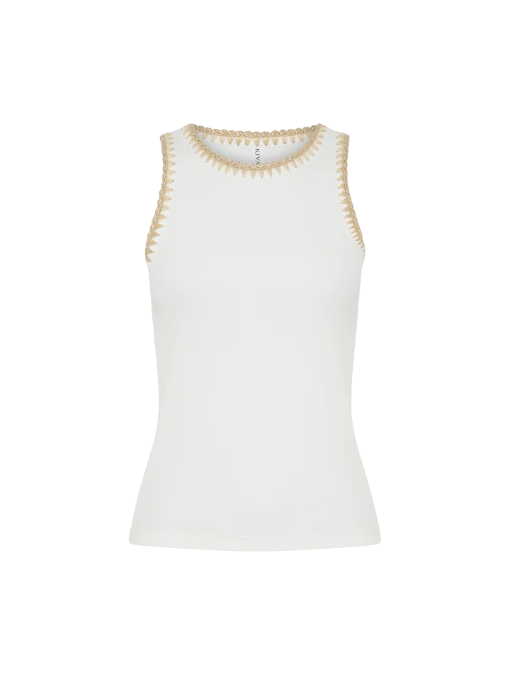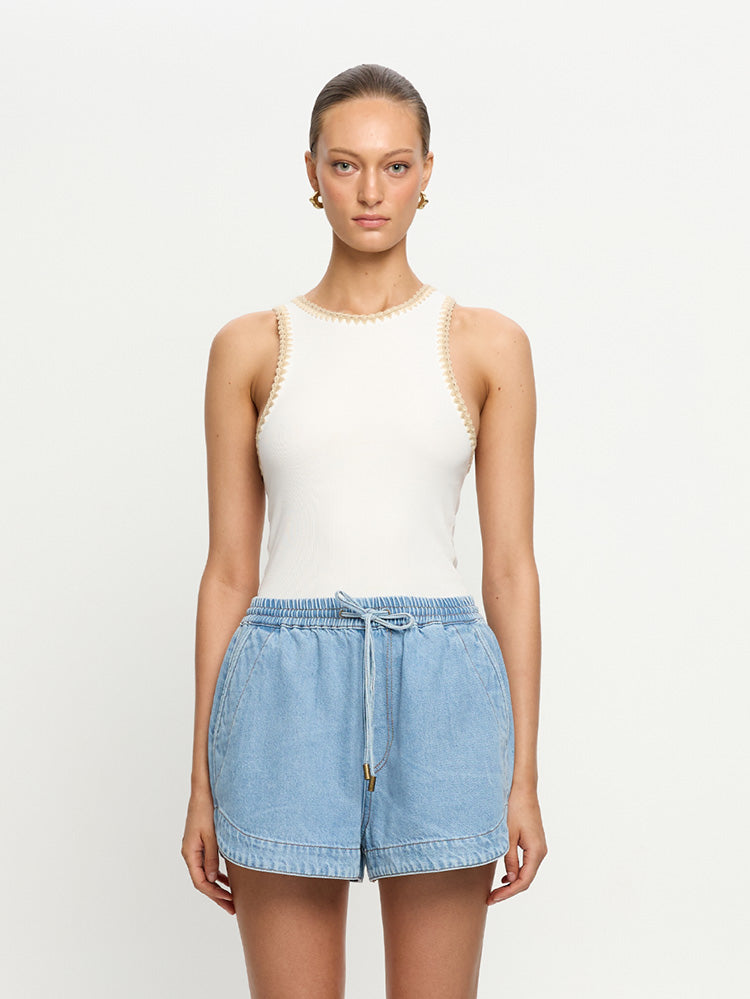 A modern essential, Kivari's signature Tallulah Spliced Tank is cut from a premium rib knit featuring a high neckline accented with contrast tan, hand-crocheted detailing adding an artisanal touch. Wear with denim or linen separates for easy daytime dressing, or elevate with tailored pants and sandals for a refined, minimalist look.