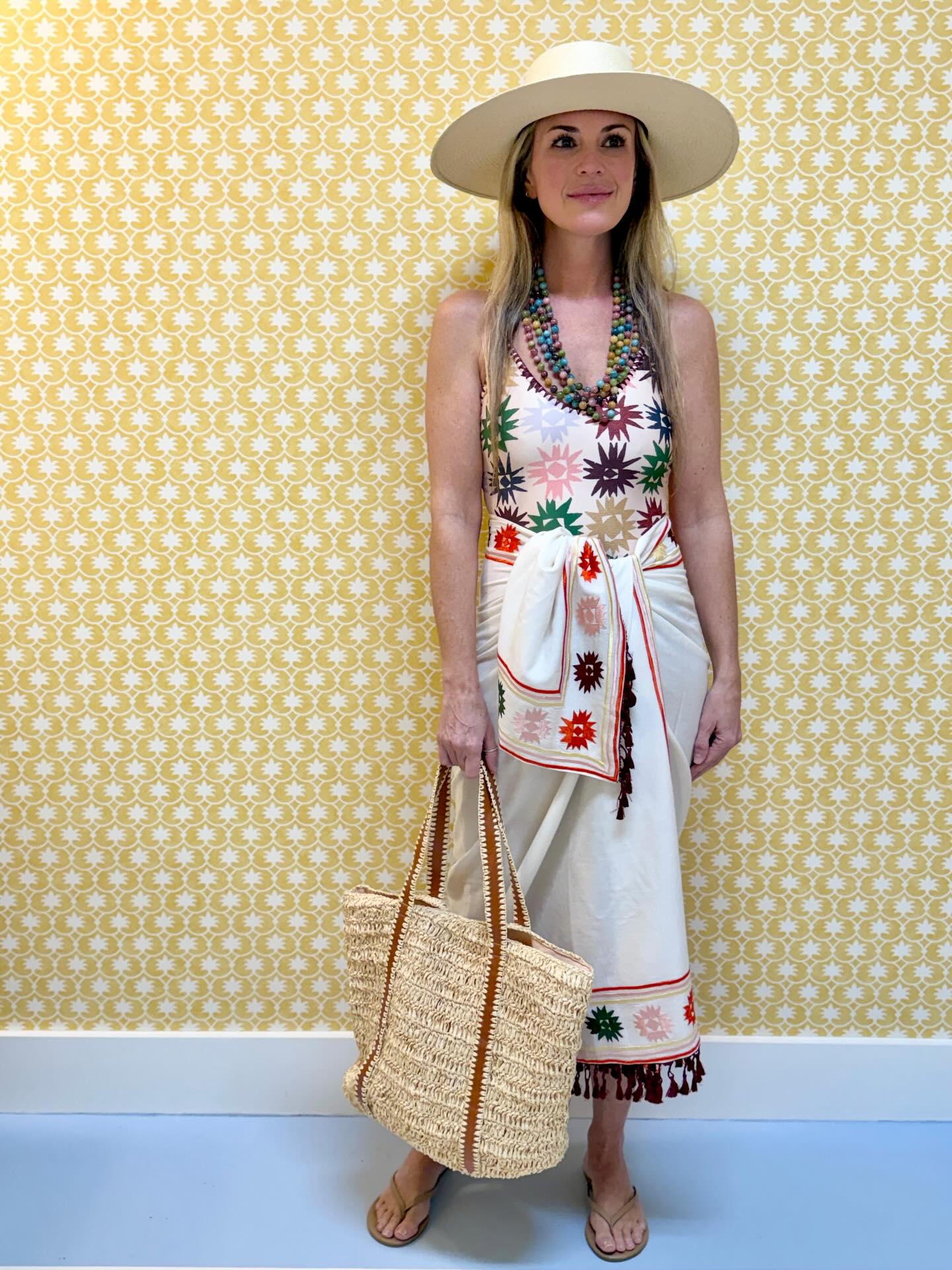 • One-piece swimsuit with a colorful geometric star pattern in shades of green, pink, burgundy, and gold
