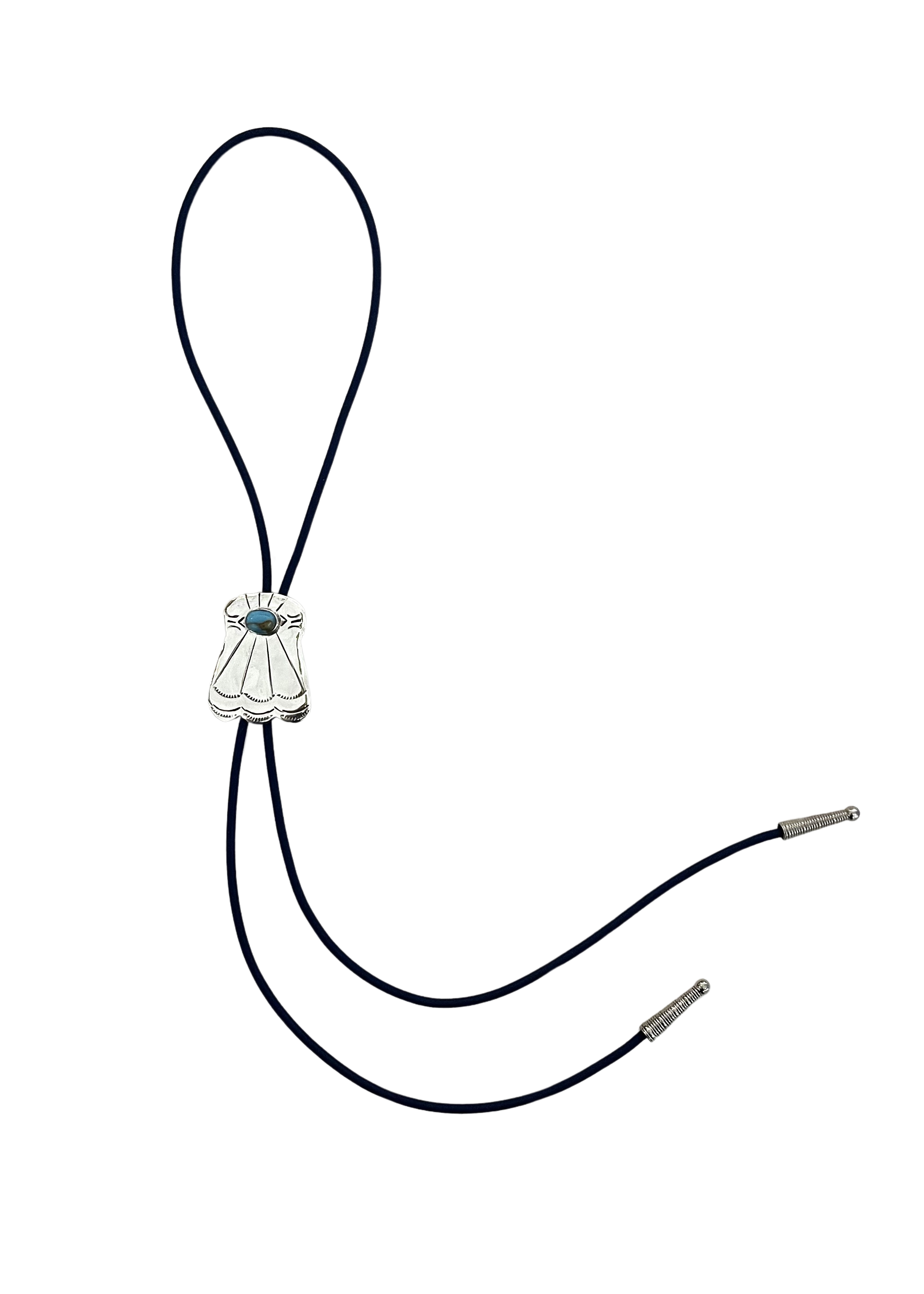 Sterling silver and genuine turquoise bolo. Cord measures approximately 34" long with sterling silver tips. Cord is interchangeable. Because each piece is truly one of a kind, the turquoise stone may vary slightly in veining but consistently the same color turquoise.
