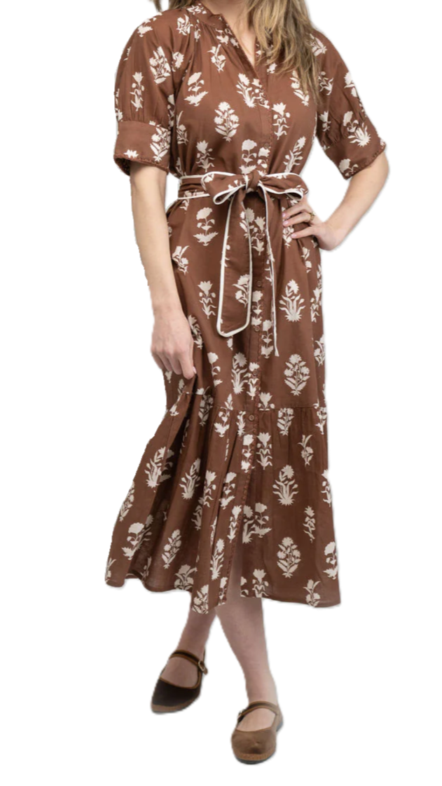 The Jane Dress features a v-neckline, quarter length sleeve and an optional belt and a playful ruffle hem.