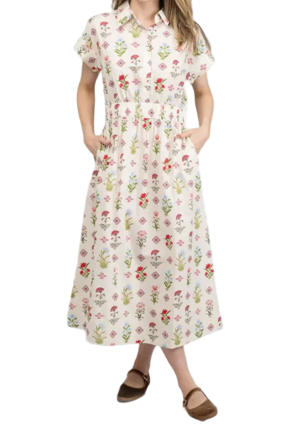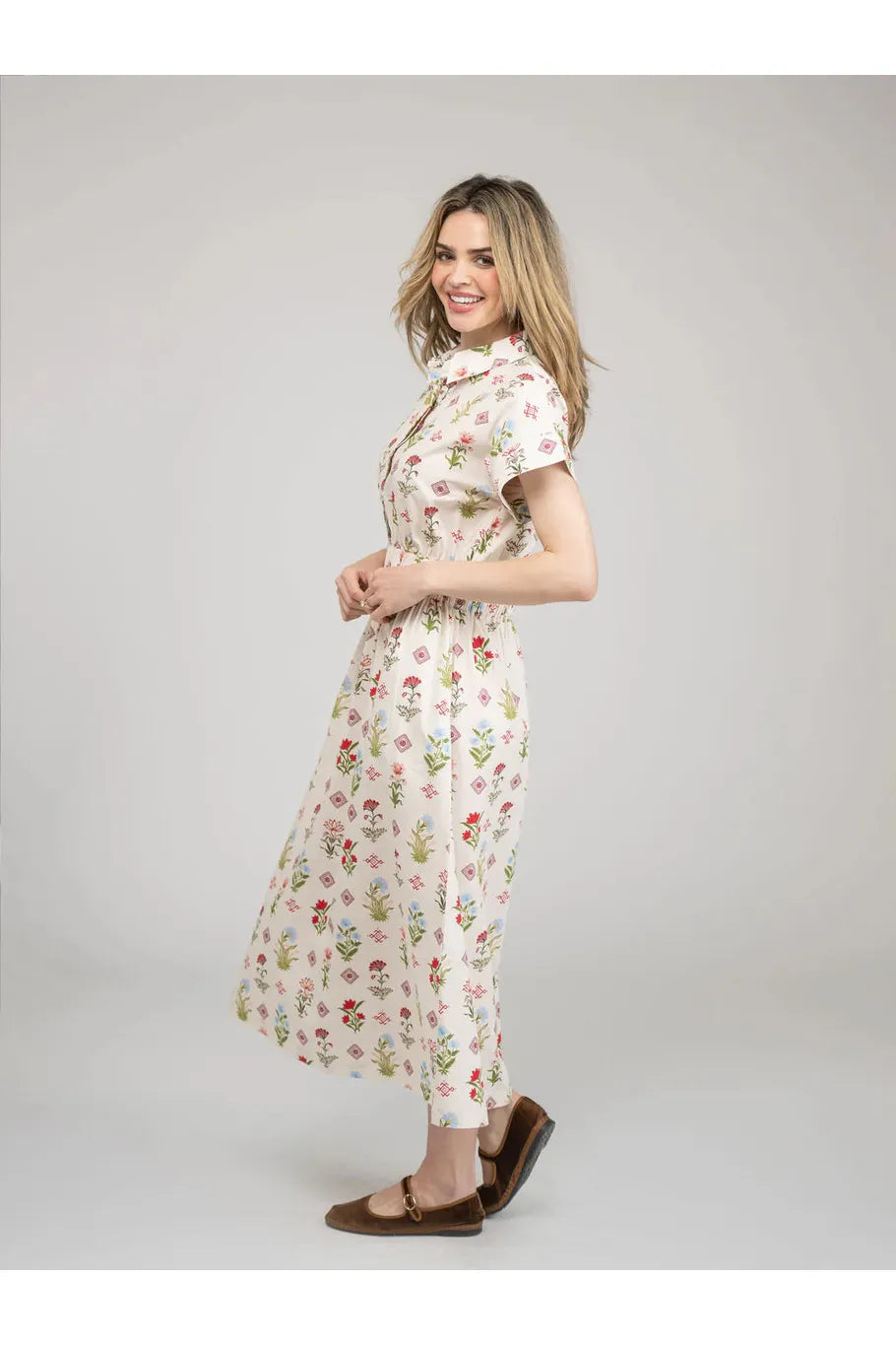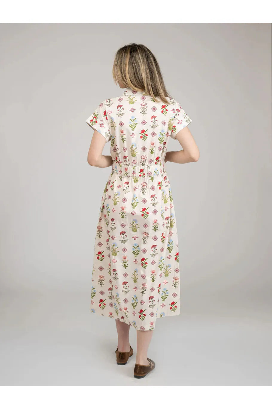 Discover the exquisite Lisa Dress, featuring a stunning Ivory Buti Flower. This midi dress boasts a crisp, shirt-like collar and flattering sleeves, while its elastic waistband ensures both style and comfort for all-day wear.