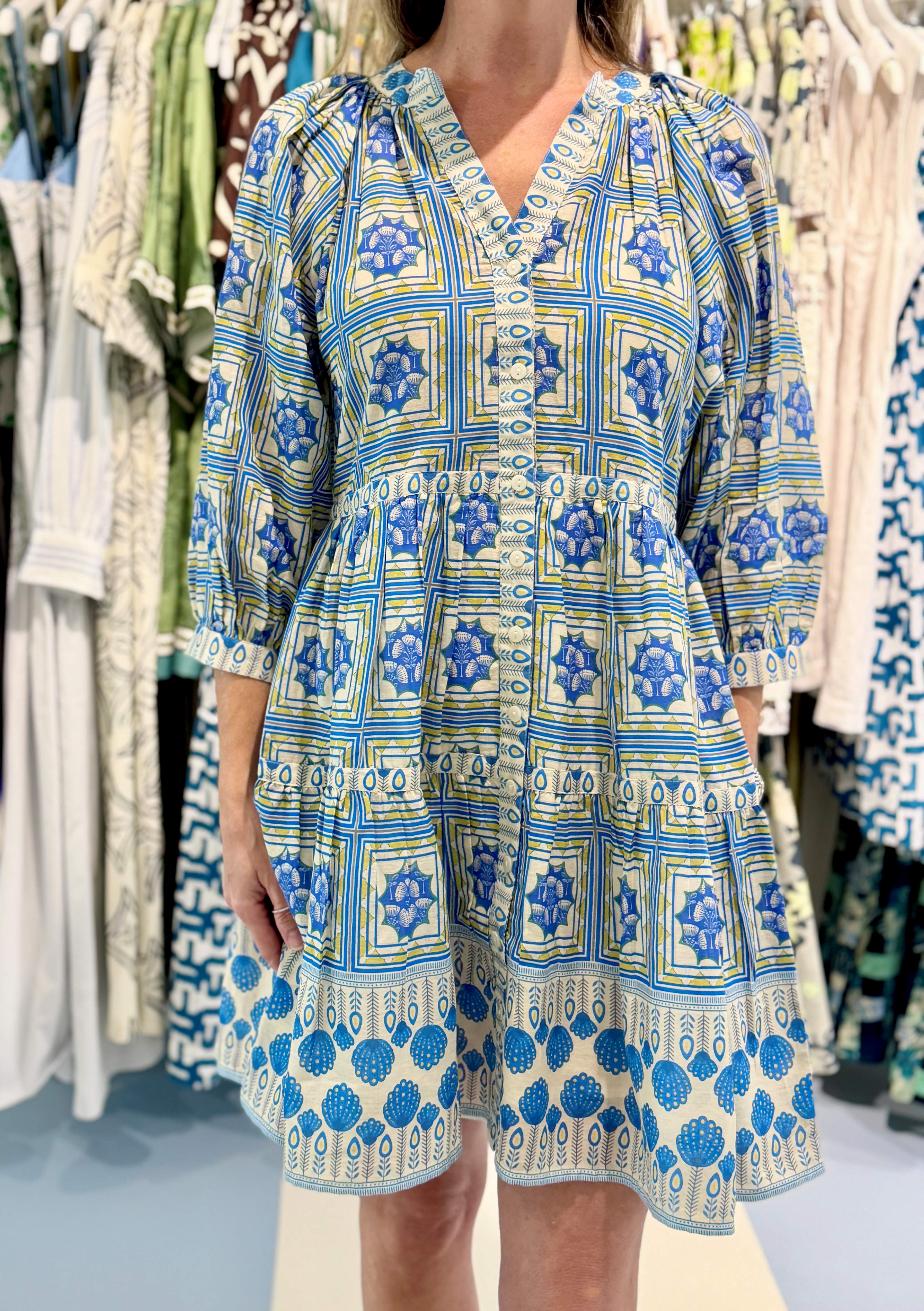 Bell Clara Mini Dress, Blue Yellow Motif