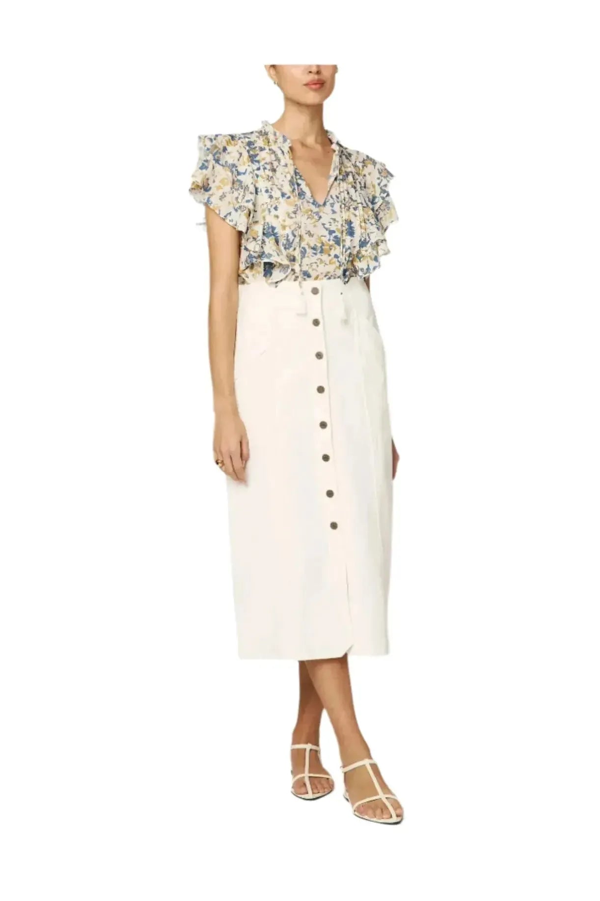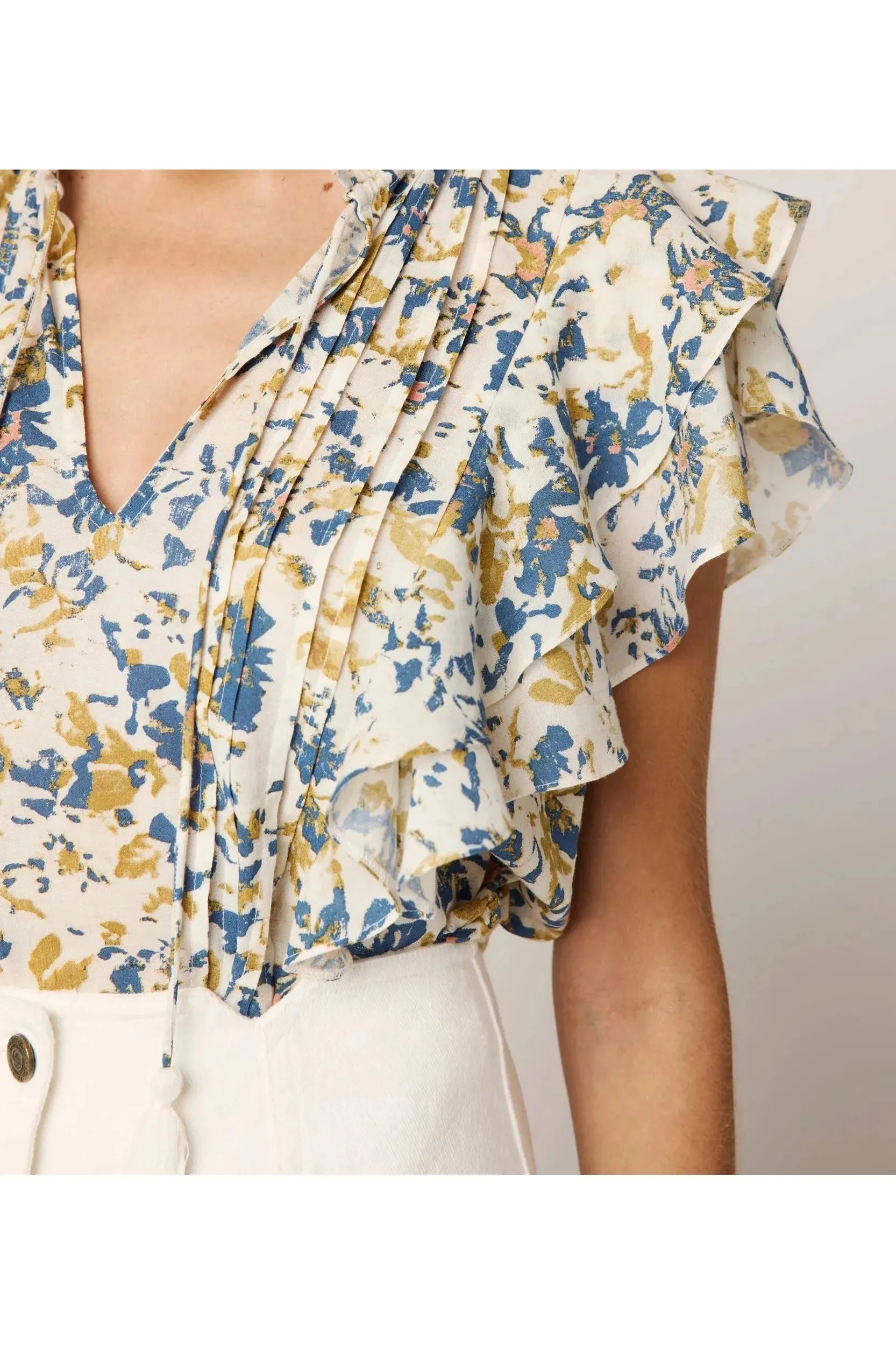 Ethically handmade in India, the Arista Blouse is effortlessly elegant in a hand-printed floral design. Featuring flutter sleeves, a soft ruffle at the neckline, and a delicate tie detail, this slip-on style brings romantic movement and ease. Pair it with high-rise denim or a midi skirt for a polished everyday look.