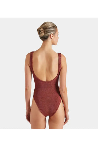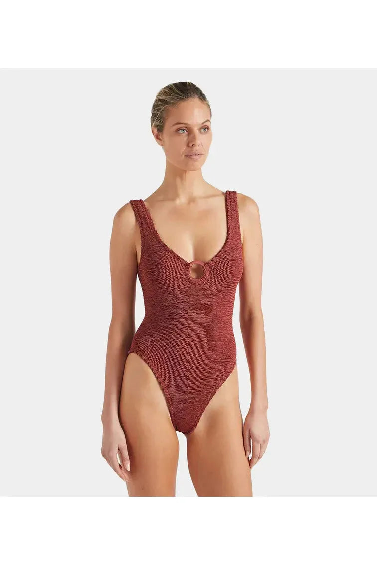 Modern swimsuit, timeless appeal. With tonal hoop detailing and a deep-v neckline, Celine has understated glamour down.
