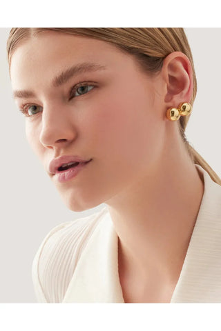 Two luminous spheres create the illusion of a double piercing, yielding galactic appeal and endless surfaces of shine. The bottom sphere has a post backing, and the upper sphere has a clip on backing. Finished in high-polish gold.