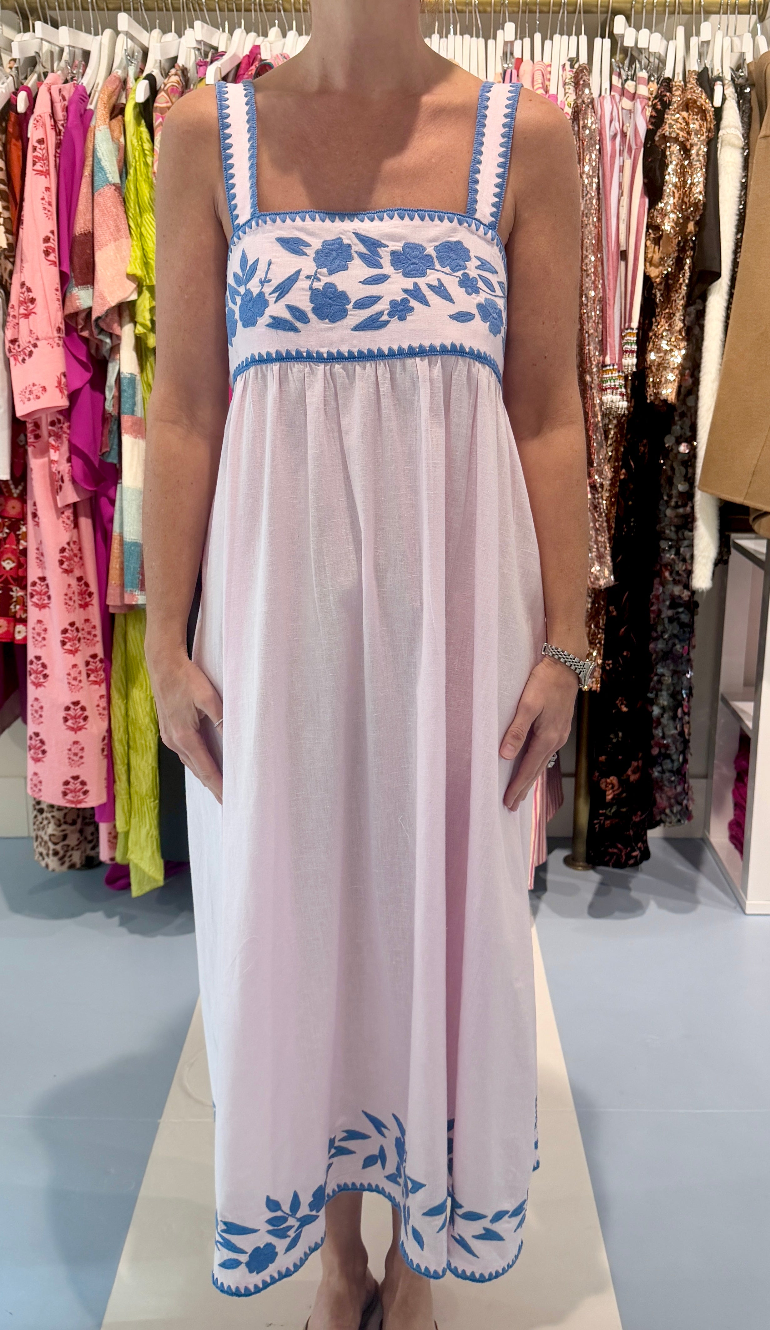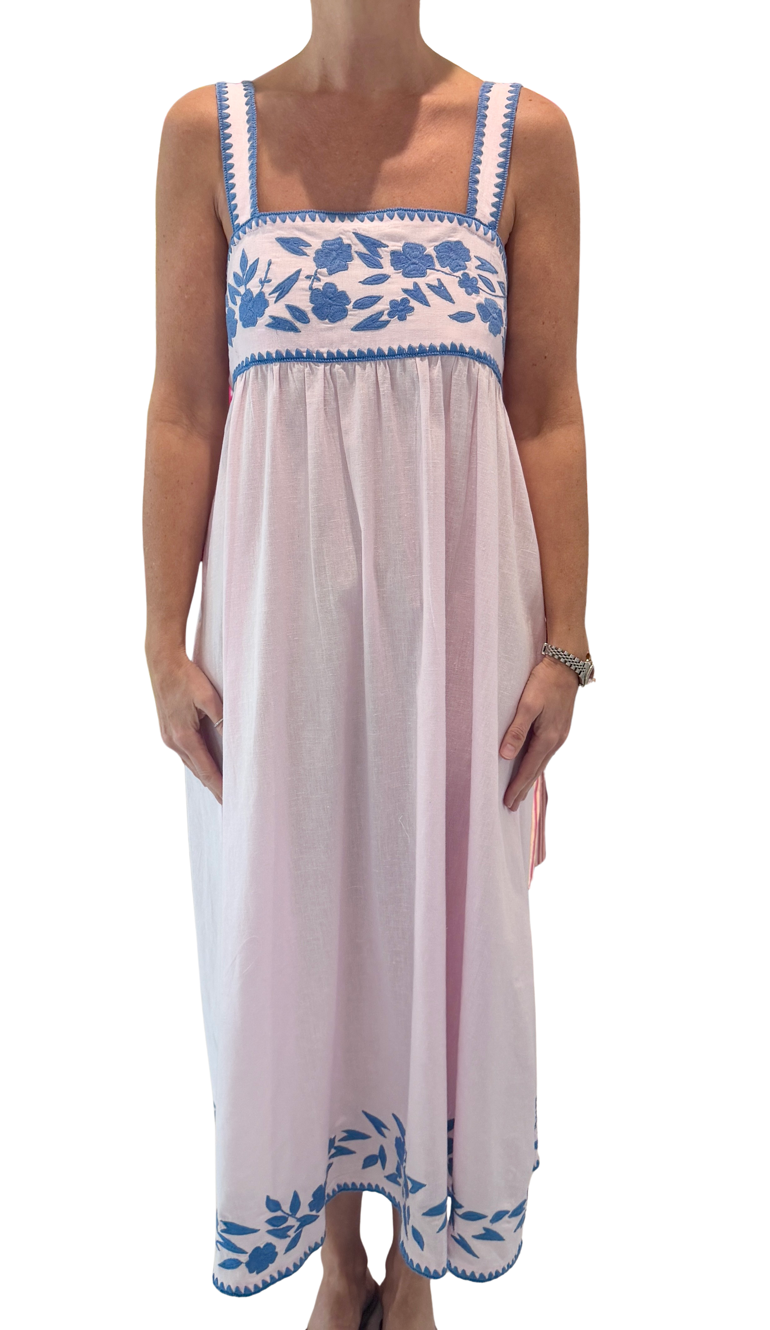 Embroidered trim along the bust, straps, and hem line