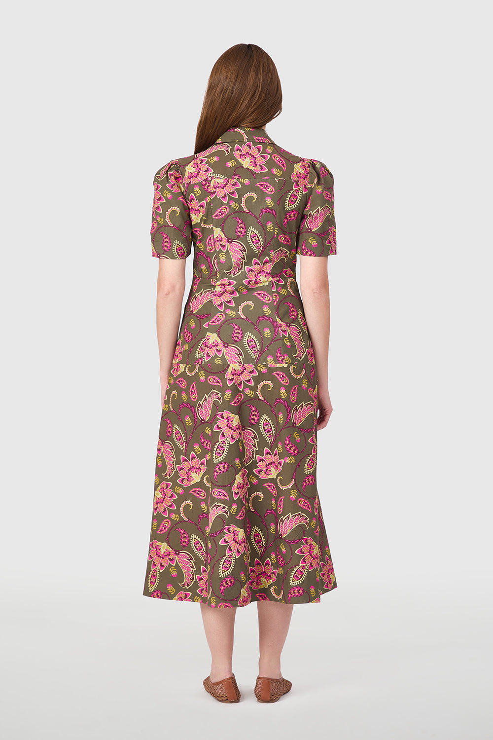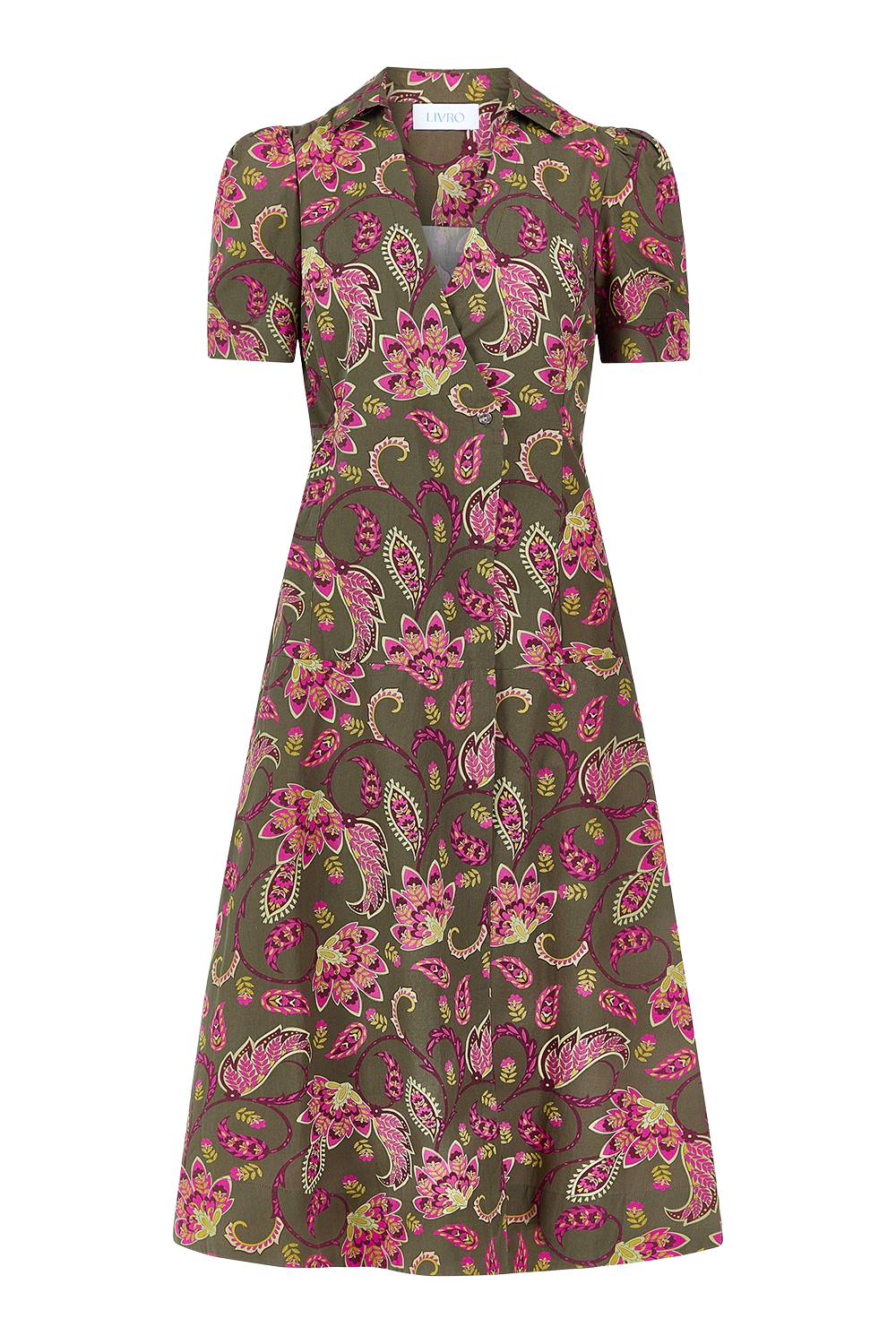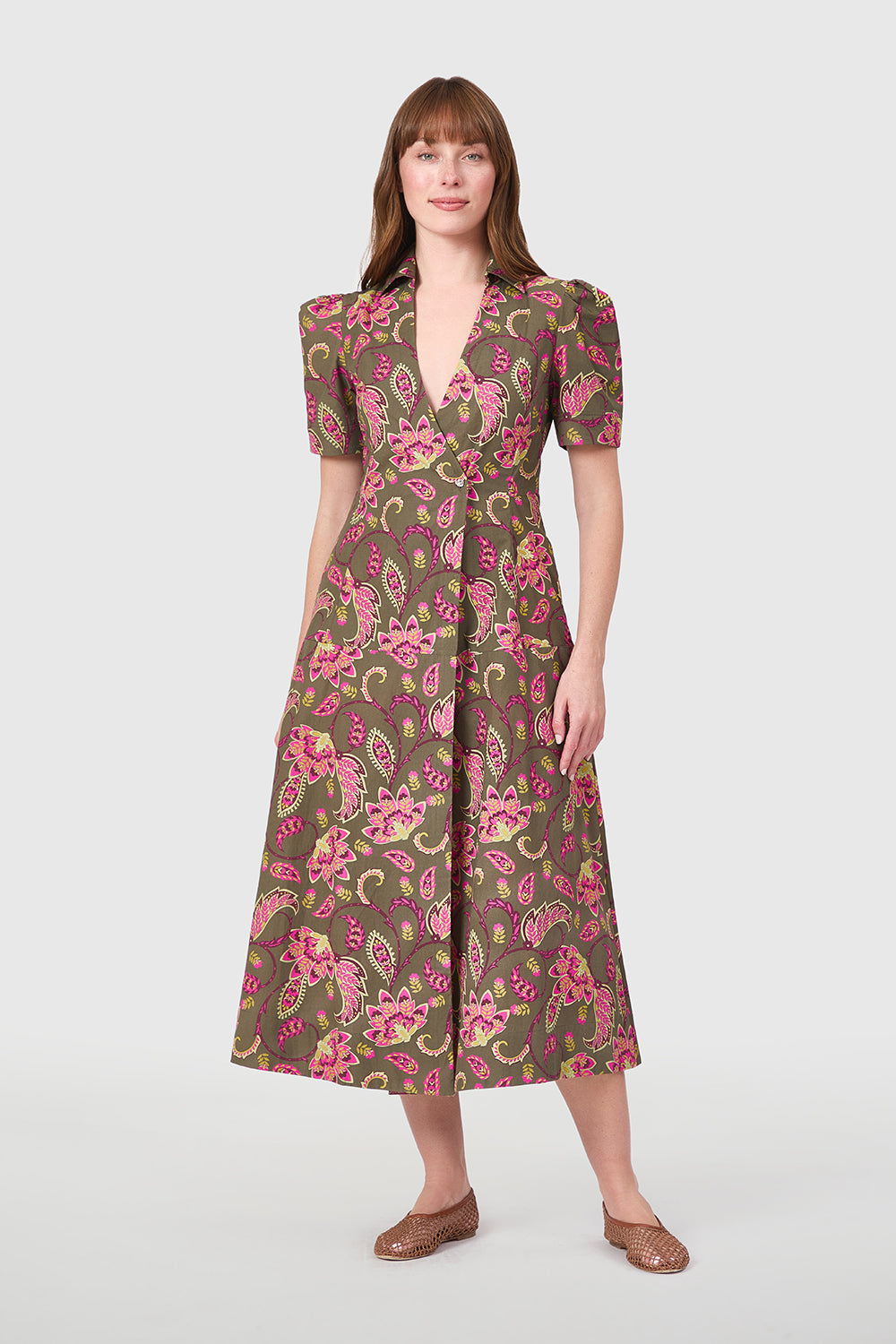 The Clark Dress features a flattering faux-wrap bodice with a notched collar and short, tailored sleeves. It’s designed with a defined waist and an A-line skirt that falls just below the knee, creating a feminine and structured silhouette. A subtle side button detail adds interest to the wrap-style front.