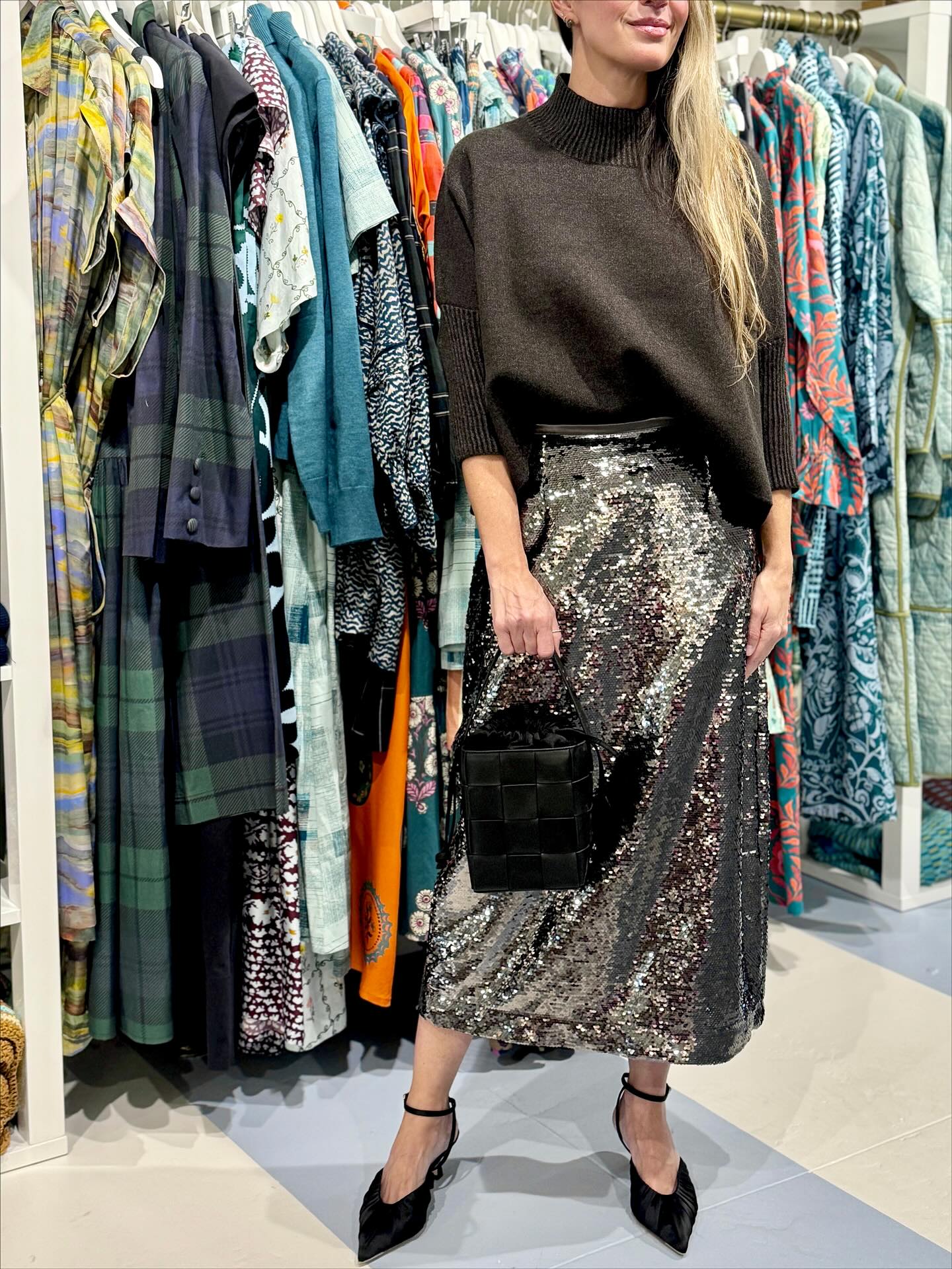 Say hello to instant glamour with minimal effort. Our sequined Wray skirt in Platinum features a relaxed pencil silhouette that catches the light with every step.