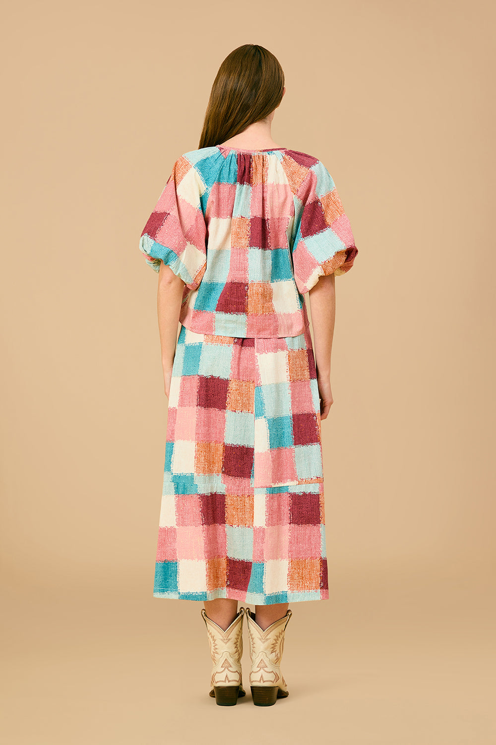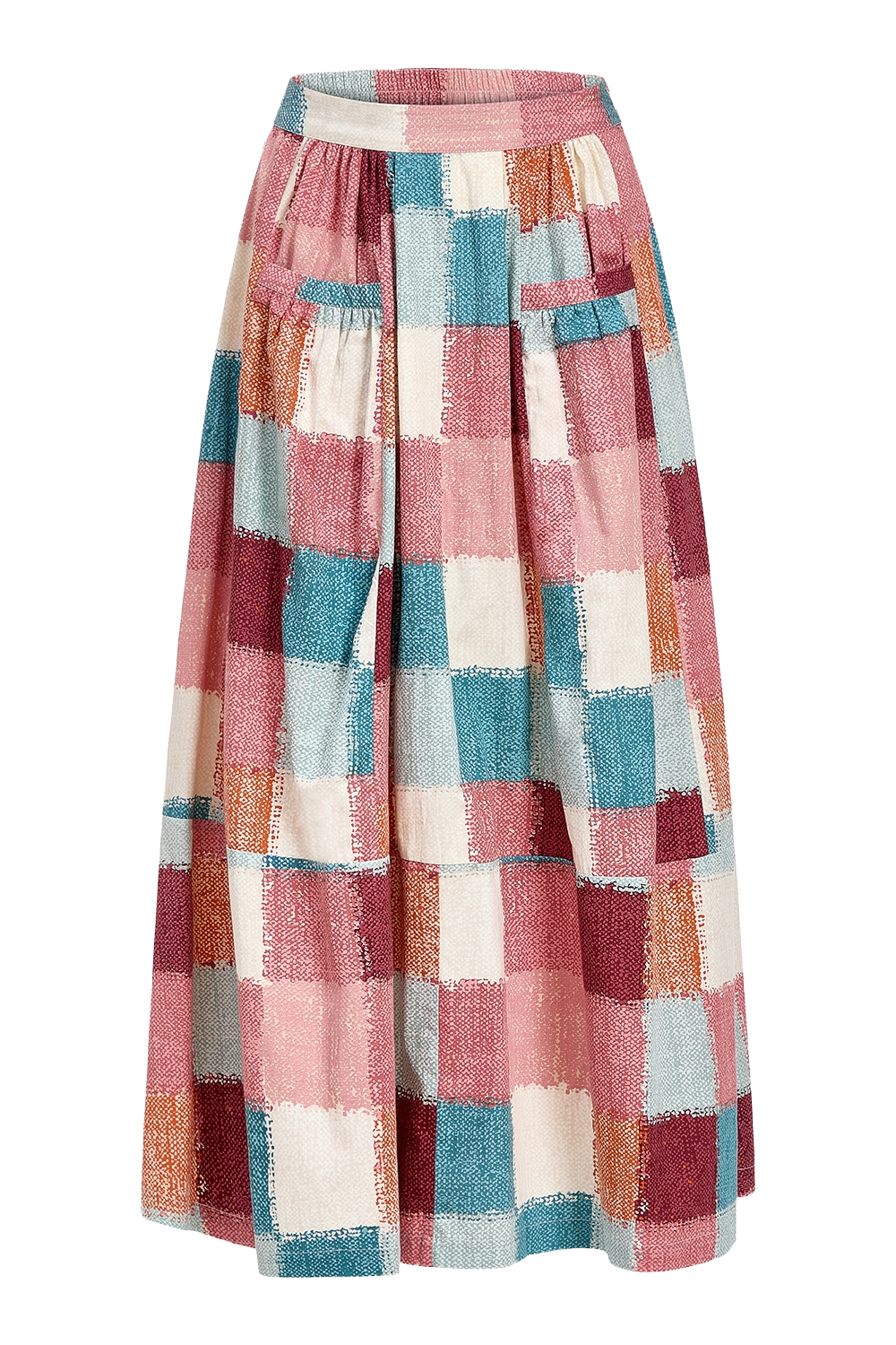 The Gabby Skirt features a flattering midi length with practical front pockets. Its unique design combines a structured set waistband at the front with an elastic waistband at the back, ensuring both a polished look and comfortable fit. The bold cottage quilt pattern adds a textured look, making this skirt a stylish addition to any wardrobe.