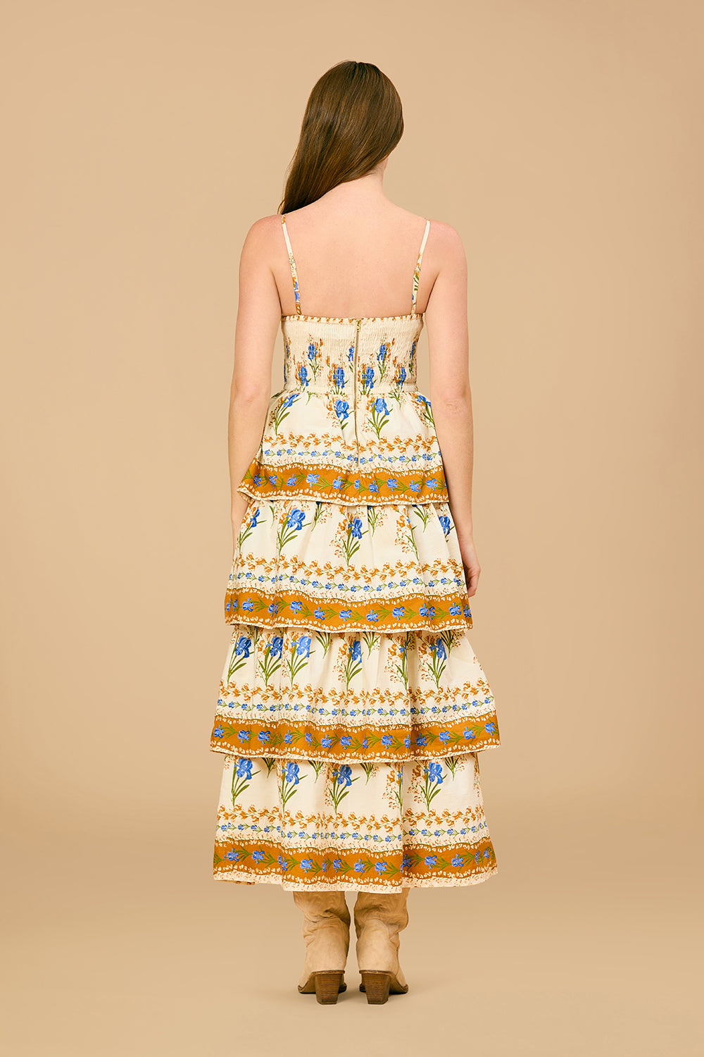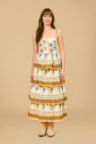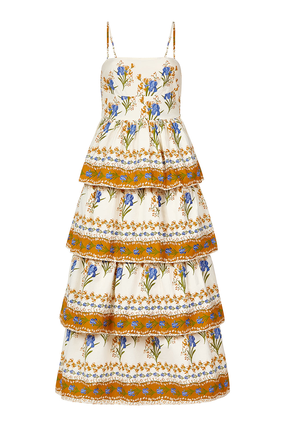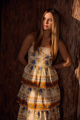 The Ophelia dress is a dreamy, romantic statement piece. Featuring a fitted, structured bodice with a square neckline and thin spaghetti straps, it flatters the upper body while maintaining an effortlessly feminine aesthetic.