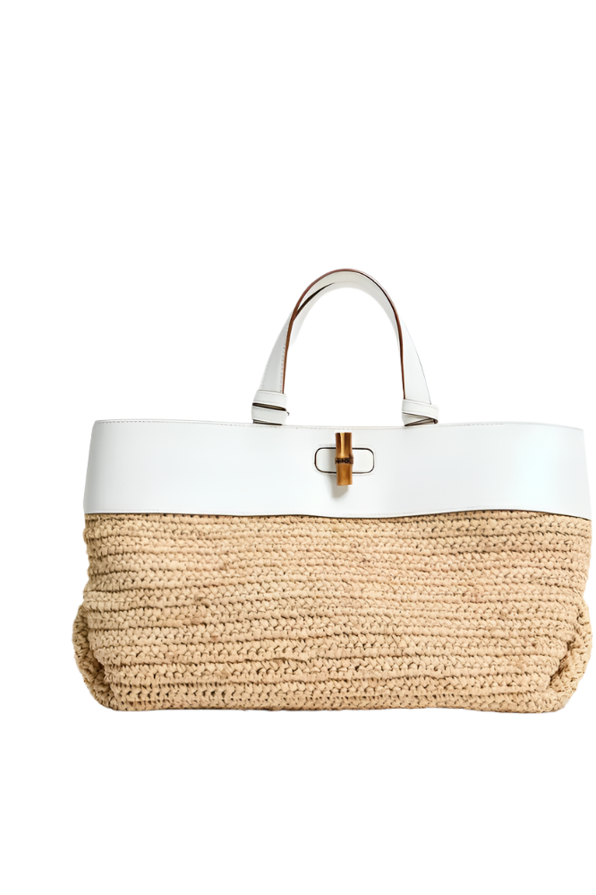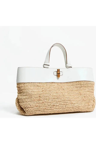 • Hand-crochet raffia handheld tote with calfskin top trim and bamboo turnlock