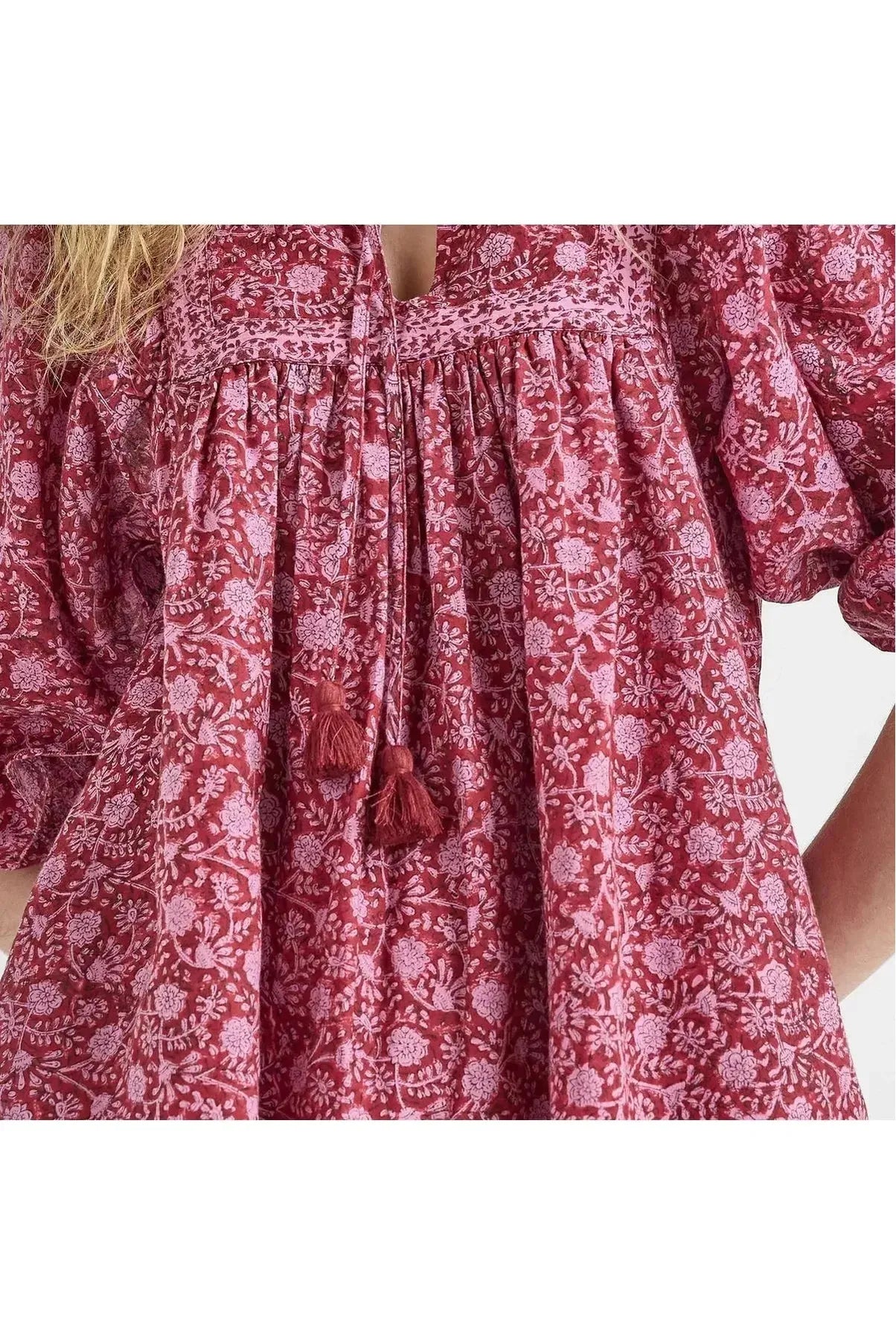 New Color! A rich combination of purple hues updates one of our flock favorite patterns, Burgundy Garden Floral. This gorgeous swirling floral, a classic interpretation of the traditional vintage block prints that we love so much, brings our flock favorite Women's Short Sanaa Dress to life. Design highlights include gathered 3/4 length puff sleeves, an eye catching contrasting border print and tasseled ties at the chest. A faux shell button at the back secures the simple keyhole button closure. Perfect for schools runs and weekend parties.