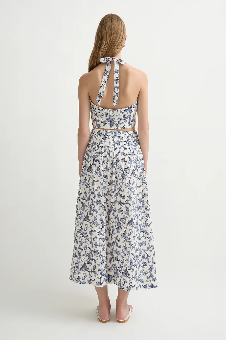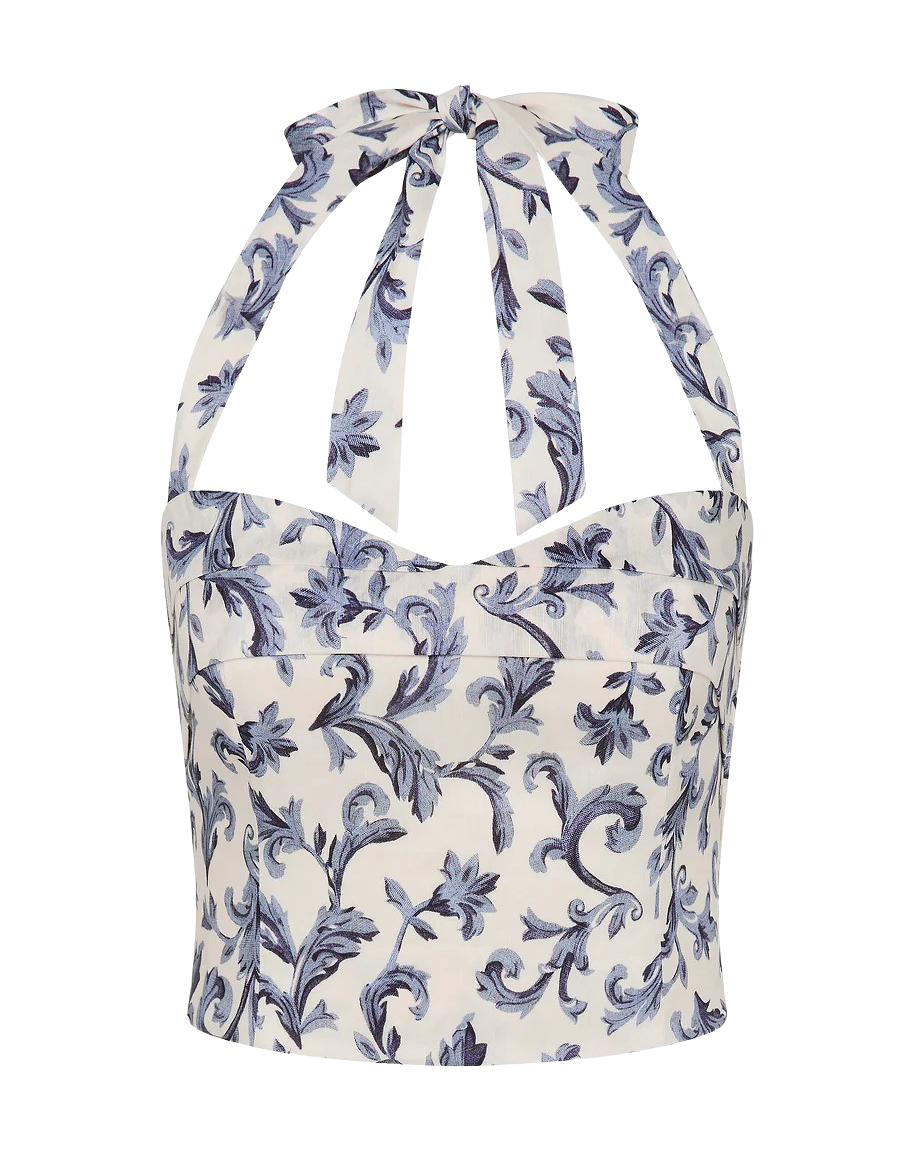 Tailored from a premium linen silk blend, the Rue Halter Top features a sweetheart neckline with pleat detailing and adjustable halter straps that tie for effortless wear. Designed with a fitted bodice in vintage inspired floral print.
