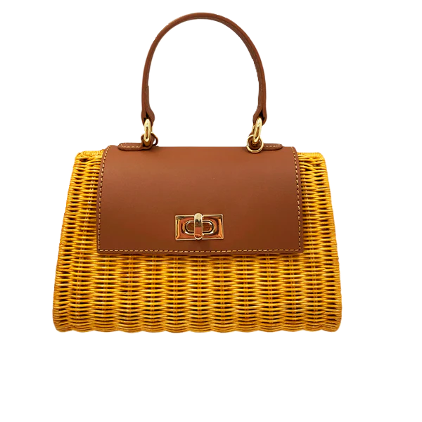 The Yasmin Light Honey bag is handcrafted from natural wicker, with a caramel-colored leather lid and handle. It features a structured design, a gold-tone metal clasp, and a sophisticated finish. It comes with a leather crossbody strap.