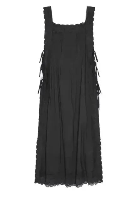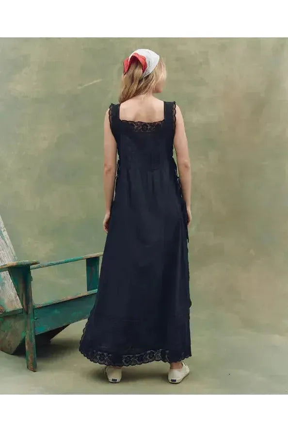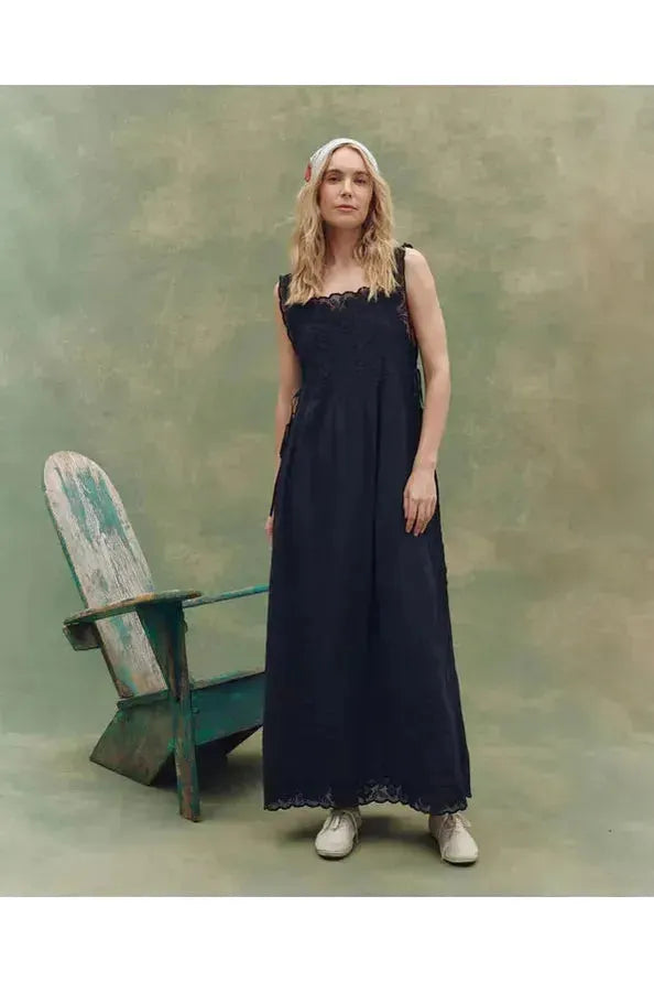 The Attic Lace Dress is inspired by a cherished Victorian dress — the kind passed down through generations and worn in the height of summer. Made from airy cotton slub with the most delicate embroidered details, it features a square neckline and low armholes for an easy, open feel. Wide, scalloped cotton lace frames the edges, with matching lace tracing down the sides of the dress, where fixed cotton ties are loosely knotted for both beauty and function. Midi length, falling at the low calf, and finished with a separate cotton slip for ease and layering.